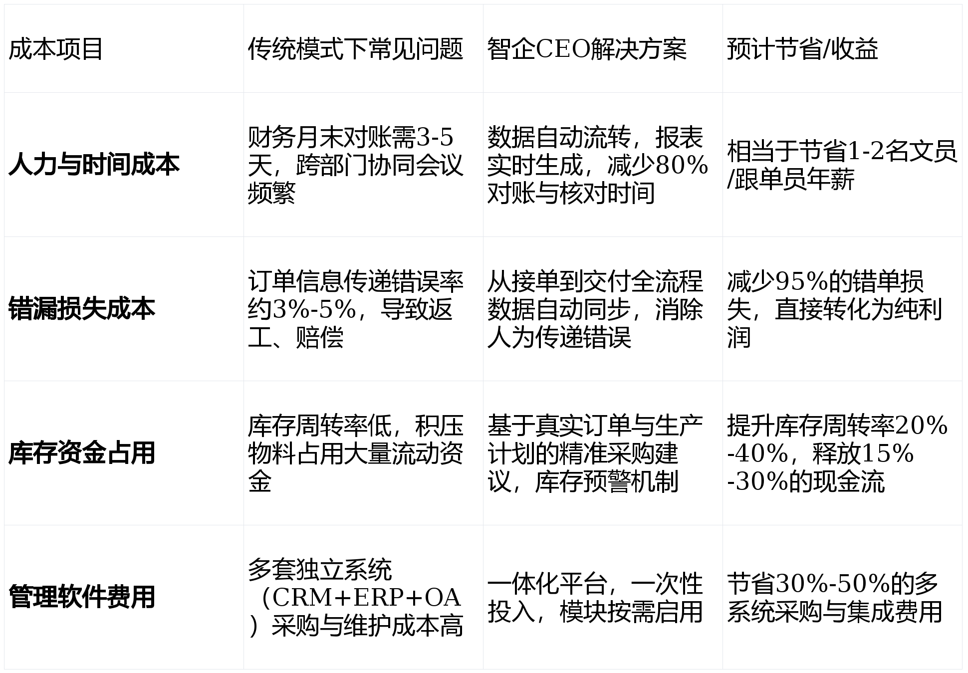 浙江一家年营收约3000万的工贸企业,在引入智企CEO系统一年后,财务数据显示:库存周转天数从105天降至68天,订单准时交付率从76%提升至94%,综合管理成本降低约8%。老板本人每周用于跨部门协调和数据处理的时间减少了15小时。
