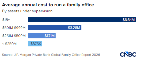 该行调查发现,管理资产规模至少10 亿美元的家族办公室,年均运营成本平均为660 万美元。自摩根大通 2023 年开展上一次家族办公室调查以来,平均成本已增加 50 万美元。