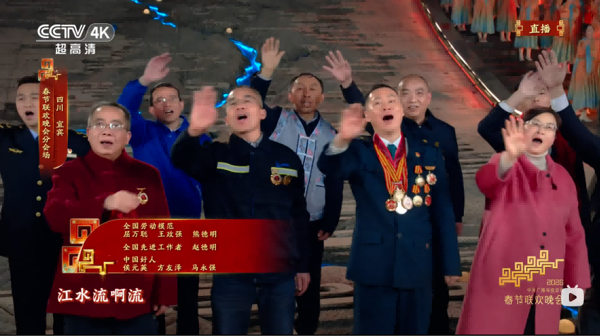随着宜宾分会场节目《立上游》的铿锵鼓点响彻三江江面,来自四川的全国先进工作者、全国劳动模范、中国好人代表作为特邀嘉宾,挥手致意,亮相舞台。