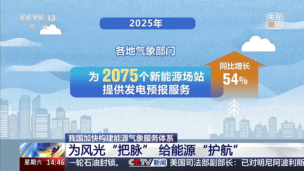 据统计,2025年,各地气象部门已为2075个新能源场站提供发电预报服务,同比增长54%;为近2700个场站提供防雷、预警等服务;为659个水电站提供气象保障。